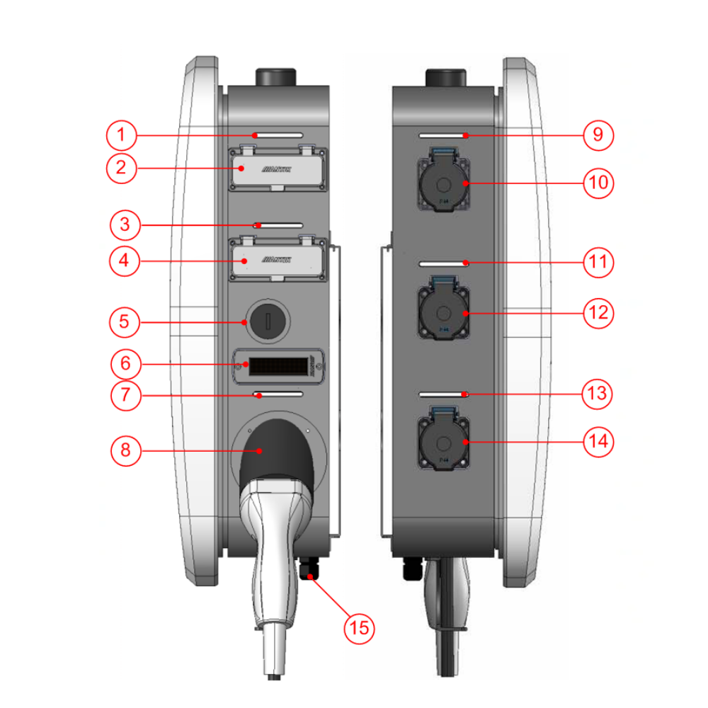 Bočné časti WallBoxu Home obsahujú kľúčové nabíjacie prvky, informačné rozhranie a výstupy pre rôzne typy zariadení.
