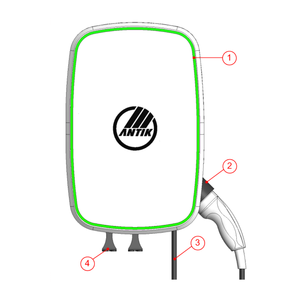 - (1) Indikačný LED pás – farebné svetlo signalizuje stav nabíjania a pripravenosť zariadenia.