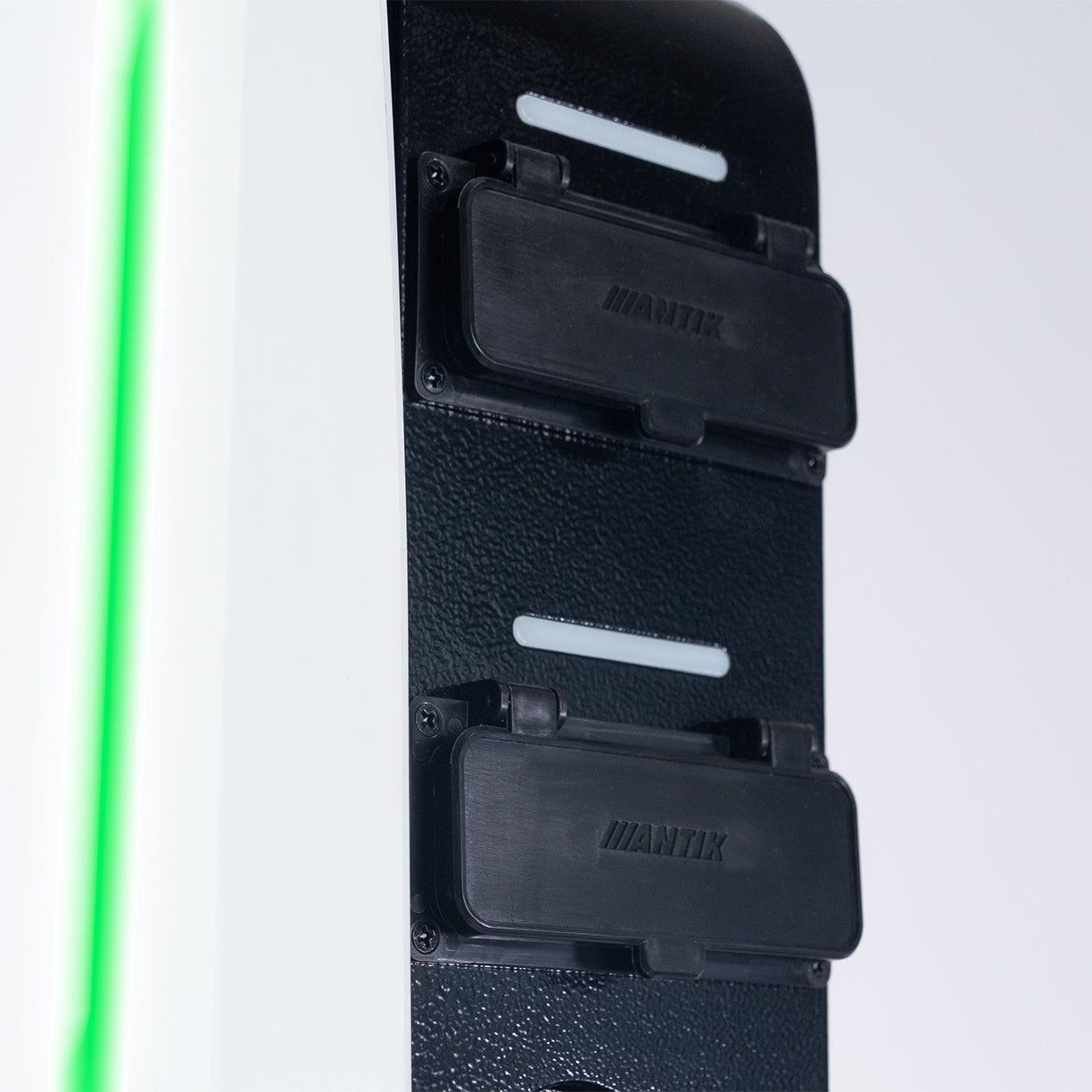 Predná časť ANTIK WallBoxu kombinuje moderný dizajn s funkčnými prvkami. LED indikácia zobrazuje stav zariadenia, používateľ má k dispozícii MiFare čítačku pre autorizáciu a dva výkonové konektory Type 2 pre súčasné nabíjanie dvoch vozidiel.