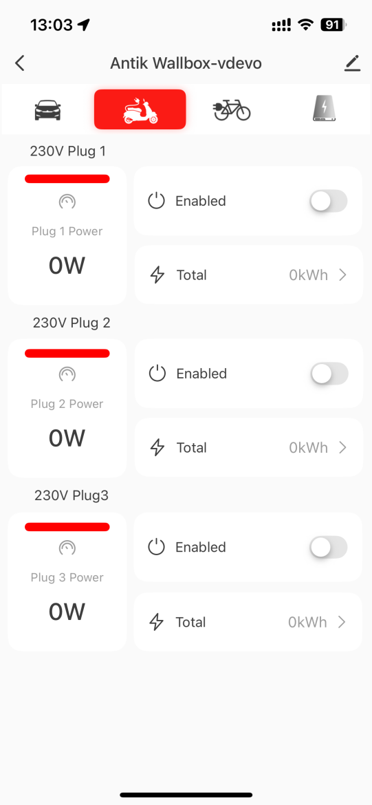 Táto sekcia umožňuje sledovať a ovládať samostatné 230 V zásuvky, ktoré sú určené na nabíjanie menších dopravných prostriedkov, ako sú elektrické skútre alebo motocykle.