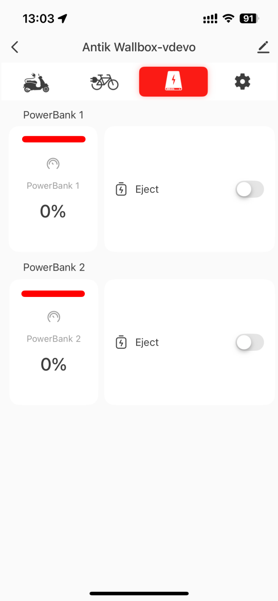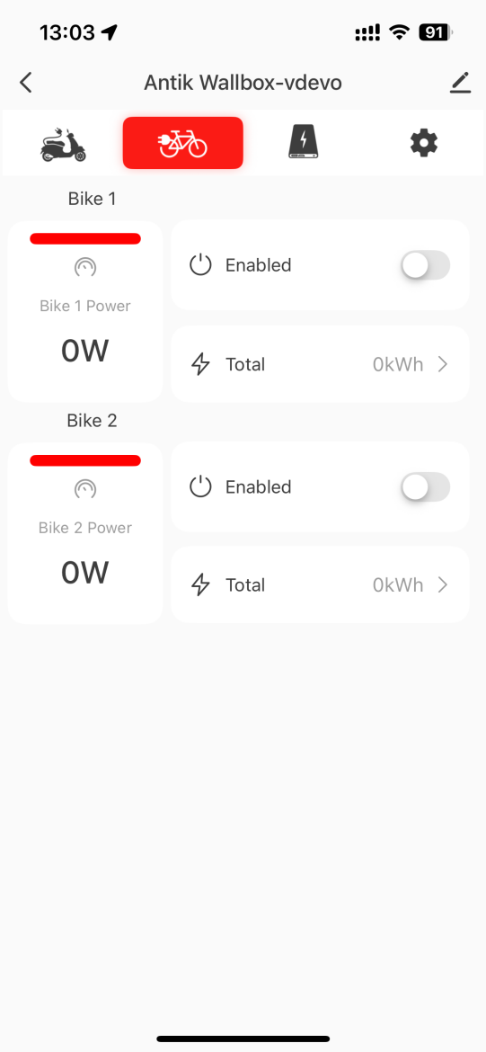 Táto sekcia v aplikácii poskytuje používateľovi jednoduchý a prehľadný spôsob sledovania a riadenia nabíjania elektrických bicyklov. Každý výstup má vlastné ovládanie, takže je možné bicykle dobíjať samostatne podľa potreby.