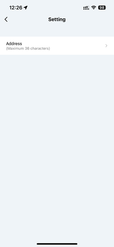 Táto obrazovka je určená na konfiguráciu zariadenia. V konkrétnom prípade na snímke je viditeľná možnosť "Address" (Adresa), ktorá umožňuje používateľovi upraviť názov (adresu) trojfázového merača v rámci aplikácie Antik Smart Home, aby bolo jednoduchšie ho identifikovať.