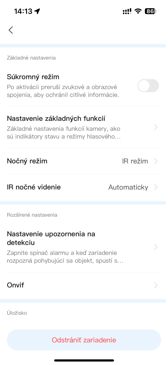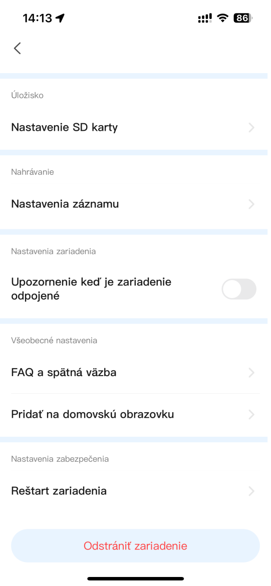- Správa úložiska – kontrola microSD karty a cloudových záznamov