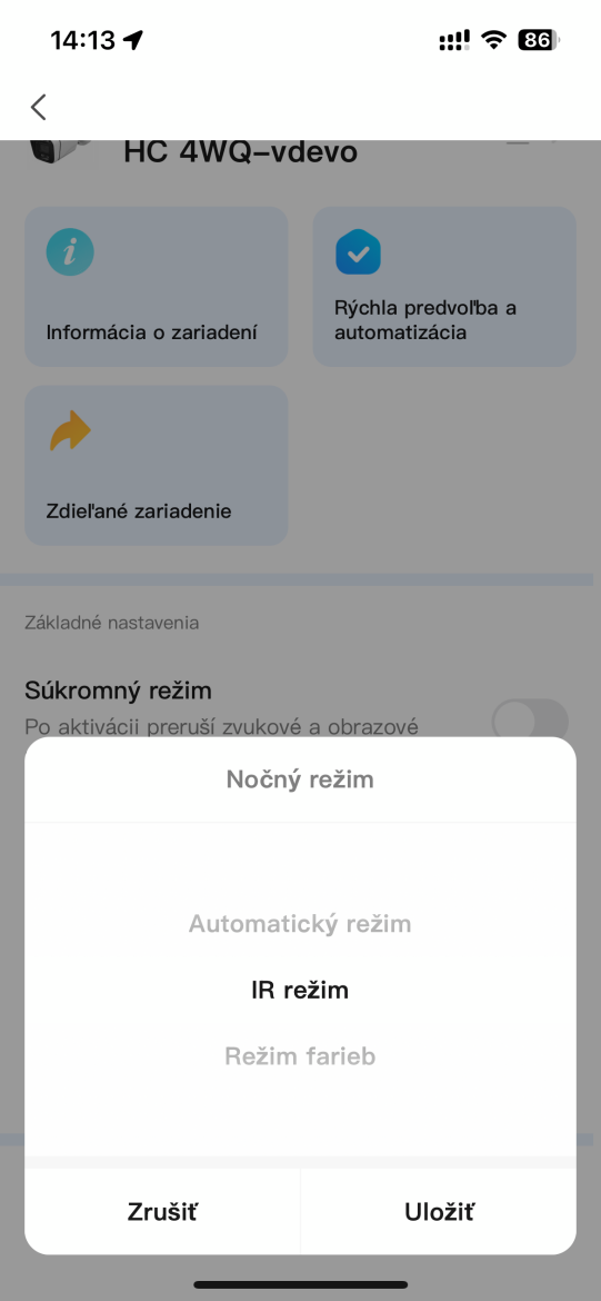 - Nočný režim a IR nastavenia – výber infračerveného alebo automatického nočného osvetlenia.