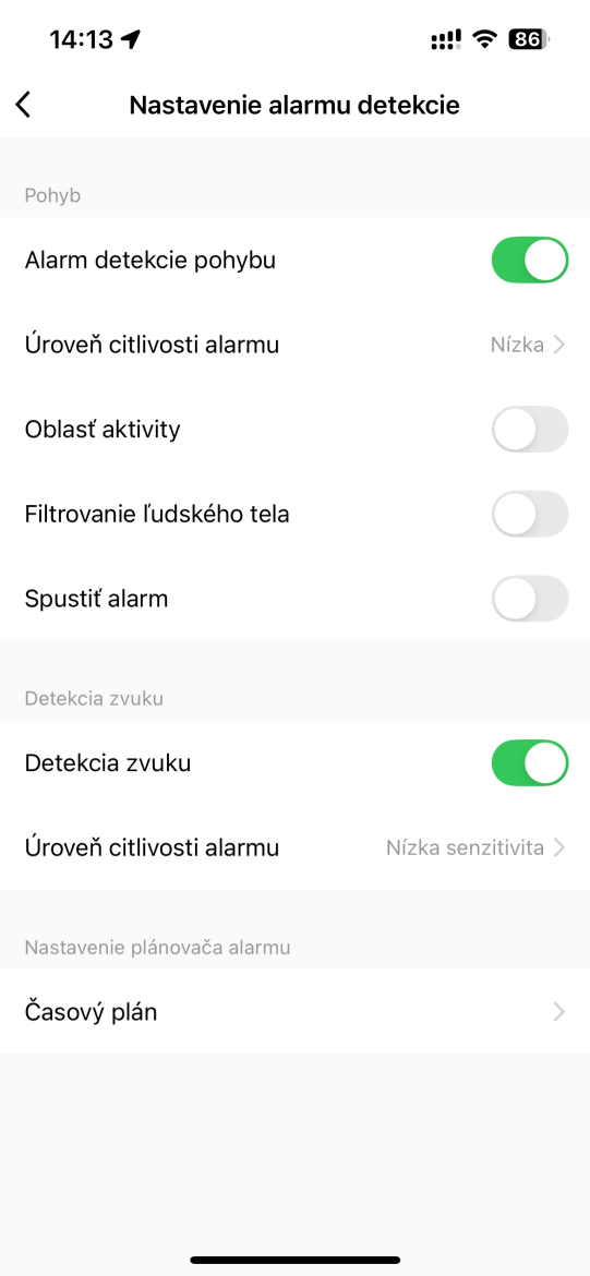 - Detekcia pohybu – aktivuje alarm pri zaznamenaní pohybu.