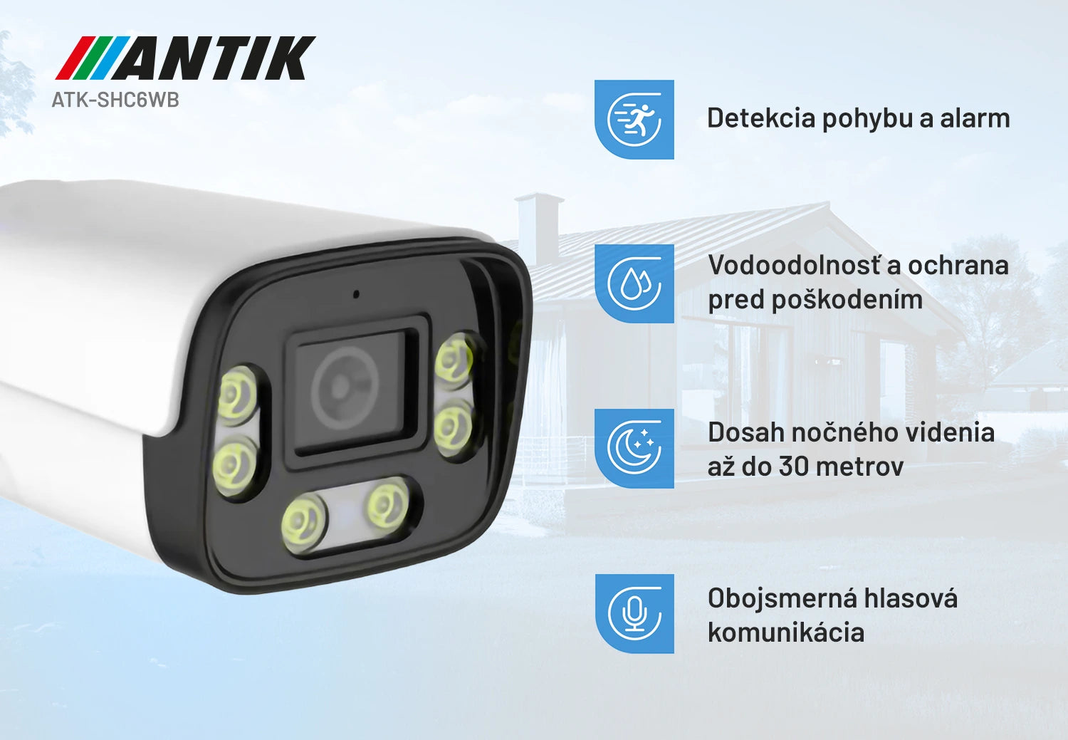 ANTIK ATK-SHC6WB je exteriérová bezpečnostná kamera navrhnutá pre nepretržitý a spoľahlivý dohľad s dôrazom na špičkovú kvalitu obrazu. Vďaka 6-megapixelovému rozlíšeniu (3072 × 2048 px) poskytuje obraz plný detailov, ktorý umožňuje presnú identifikáciu osôb, vozidiel či objektov aj pri väčšej vzdialenosti. Pokročilé spracovanie obrazu znižuje digitálny šum pri slabom osvetlení a zachováva prirodzené farby, čím zaručuje čistý a ostrý záznam vo dne aj v noci.