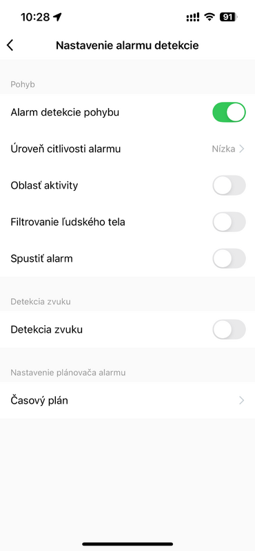 - Detekcia pohybu – spustí alarm pri zaznamenaní pohybu.