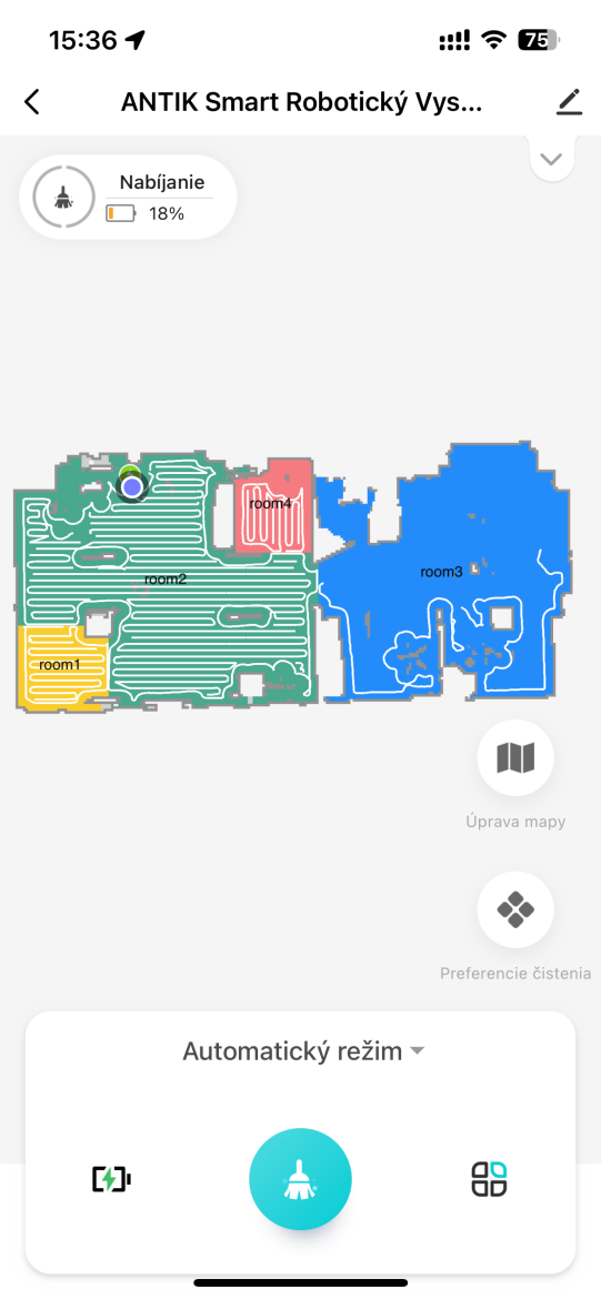 • Mapa + live stav: miestnosti, trasa v reálnom čase, percento batérie.