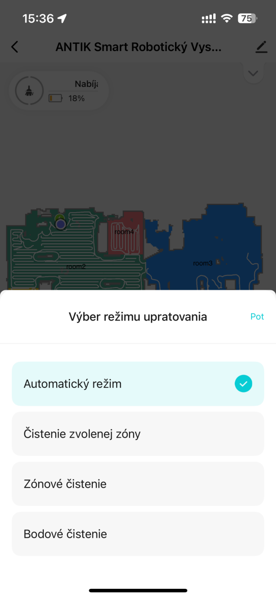• Režimy čistenia: celý byt, miestnosť/zóna, bodové.