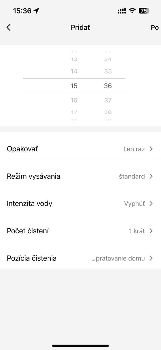 Time v minútach Definuje trvanie čistenia alebo oneskorenie pred začiatkom úlohy. Spusti čistenie po 30 minútach od odchodu z domu.