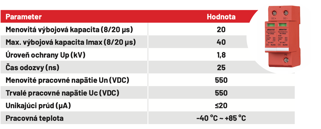 Prepäťová ochrana ATK-SPDE40 je určená pre jednosmerné fotovoltické systémy s menovitým pracovným napätím 550 V DC. Zariadenie spoľahlivo chráni FV panely, meniče a ďalšie komponenty pred impulznými prepätiami spôsobenými bleskovými výbojmi alebo spínacími špičkami.