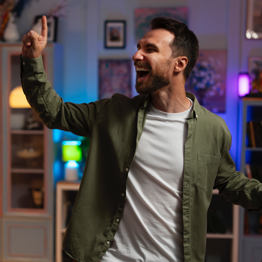 Vytvořte automatickou scénu "Osvětlení aktivované pohybem", která v nočních hodinách na základě pohybu zapne zvolené lampy v obýváku či chodbě prostřednictvím inteligentní zásuvky. Chcete-li tuto noční scénu vylepšit příjemným tlumeným světlem , zasuňte do lampy inteligentní žárovku.