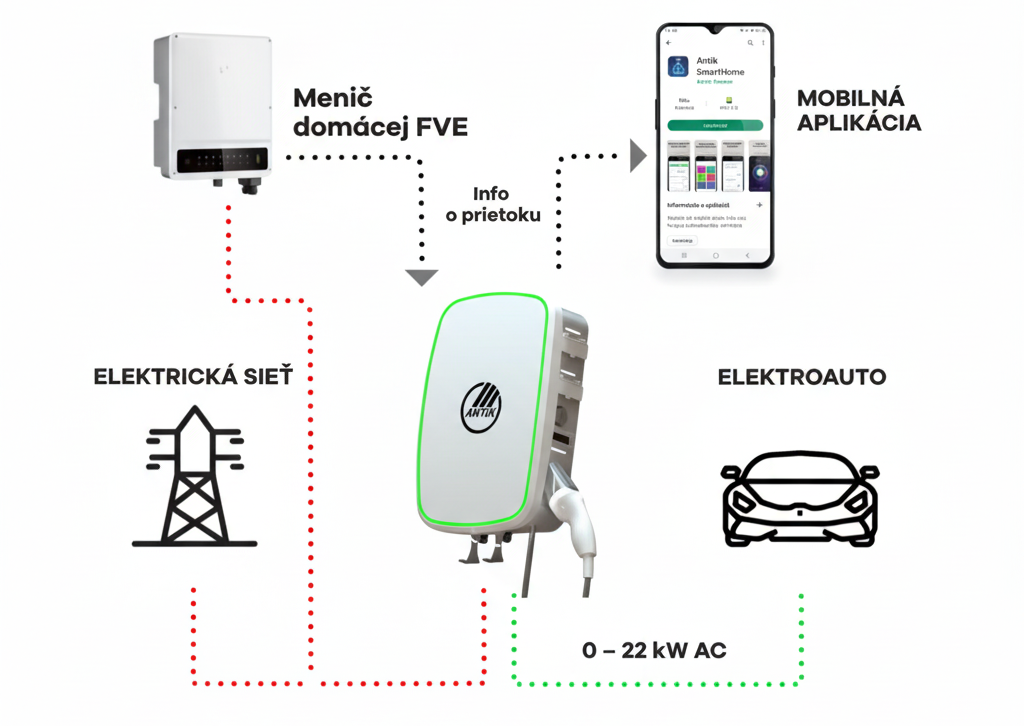Pri využívaní fotovoltického systému na výrobu elektrickej energie často vznikajú situácie, keď systém produkuje viac energie, než v danom momente dokážete použiť. Namiesto plytvania touto nadbytočne vyprodukovanou energiou z vášho fotovoltického systému prinášame riešenie jej efektívneho využitia - nabíjanie elektromobilu priamo z prebytkov energie.