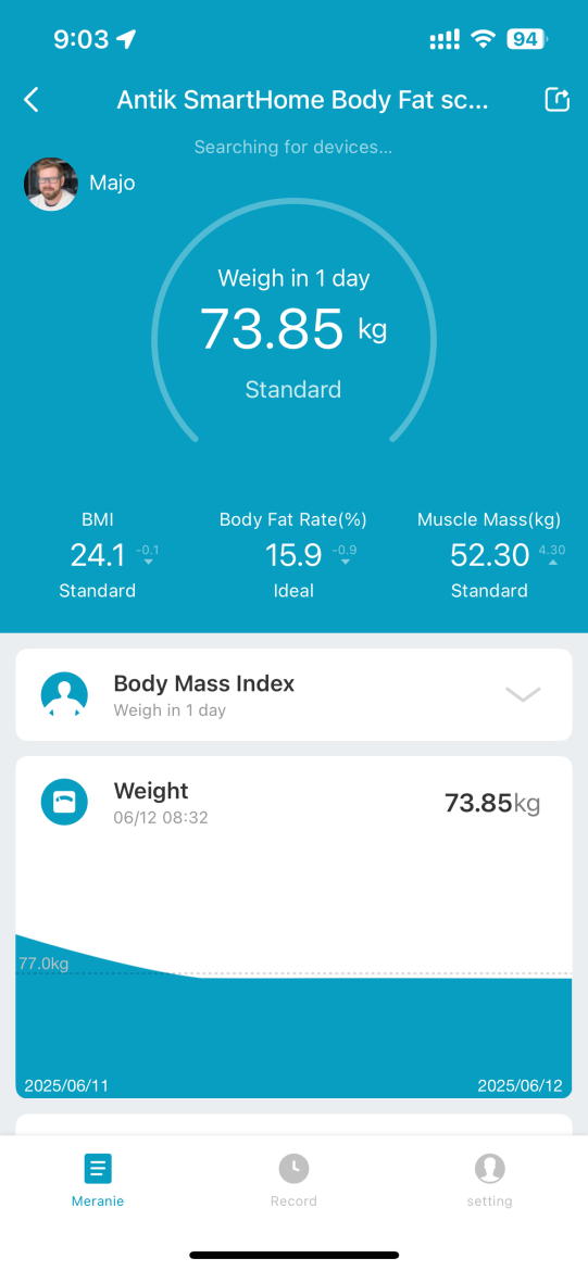 ANTIK SmartHome Biometrická osobná váha poskytuje používateľom možnosť prehľadne zaznamenávať a analyzovať históriu ich meraní, čím umožňuje efektívne sledovanie pokroku v čase. Táto funkcia je kľúčová pre detailné sledovanie zmien v telesných hodnotách a poskytuje prehľad o vývoji zdravotných parametrov.