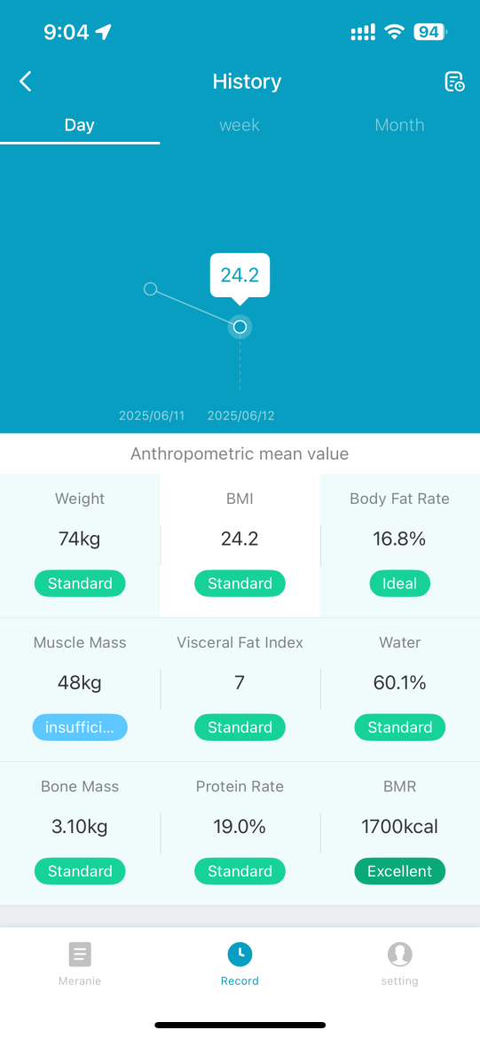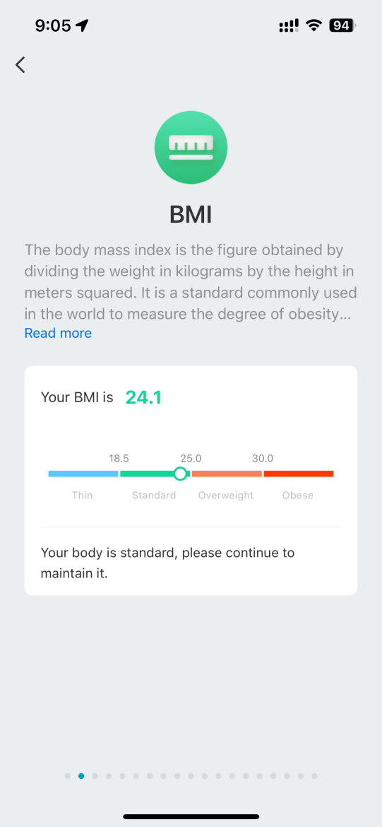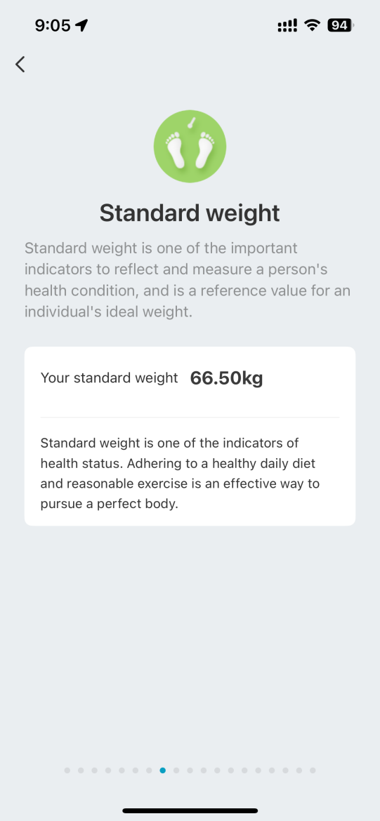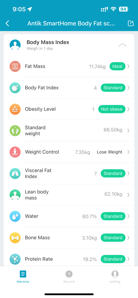 - Meranie telesných údajov: Hmotnosť| BMI | Percento telesného tuku | Svalová hmota | Tuková hmota | Index telesného tuku | Ideálna hmotnosť | Index viscerálneho tuku | Hmotnosť bez tuku | Telesná voda | Hmotnosť kostí | Miera bielkovín | BMR (bazálna rýchlosť metabolizmu | Metabolický vek | Typ postavy | Srdcový pulz